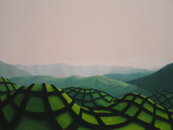kaikki näyttelyn maalaukset käsittelevät samaa aihetta, vihreää kumpuilevaa maisemaa, jota halkovat pensaikot tai puurivistöt.