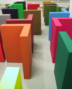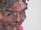 galleriaK:n huhtikuun taiteilijan materiaali on läpivärjätty kipsi. kipsi on hänelle sekä muotoa antava että värin määrittävä rakennusaine.