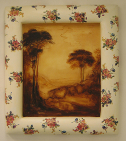 kauneuksien yhteentörmäämistä voi miettiä myös lehtisen maalaamissa tyynytauluissa. pöyheissä kehyksissä kukkivat ruusut ja taulun maisema on melkein kansallisromanttinen.