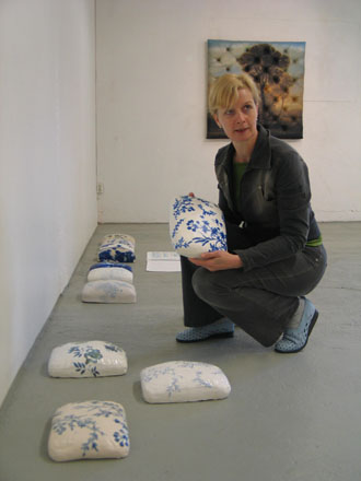 sinivalkoinen maisema syntyy posliinisista tai posliininnäköisiksi käsitellyistä savisista pulleista tyynyistä. elementtien pinnoille piirtyy kotoisia järvimaisemia tai vanhoista kukkakoristelluista lautasista lainattuja kuvioita.