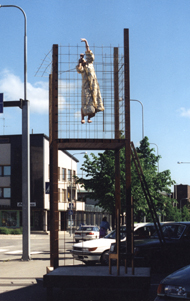 installaatio koostuu yli viisi metriä korkeasta tornista, sen vieressä olevasta kultaisesta tuolista korokkeineen sekä aukion kaikkien talojen ikkuinoissa olevista todistajista, kalpeakasvoisista katsojista.